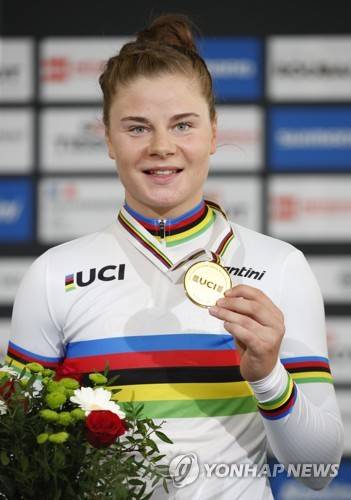 epa09543472 Belgian rider Lotte Kopecky poses with her gold medal on the podium after winning the women's Point Race at the UCI Track Cycling World Championships in Roubaix, France, 24 October 2021. EPA/YOAN VALAT