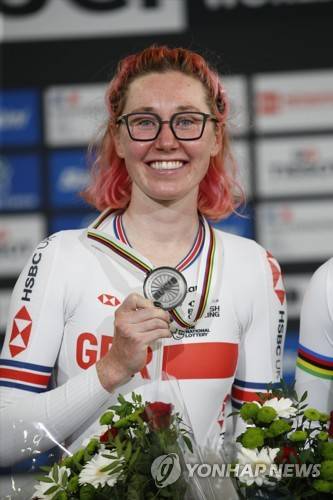 epa09543474 Katie Archibald of Britain poses with her silver medal on the podium of the women's Point Race at the UCI Track Cycling World Championships in Roubaix, France, 24 October 2021. EPA/YOAN VALAT