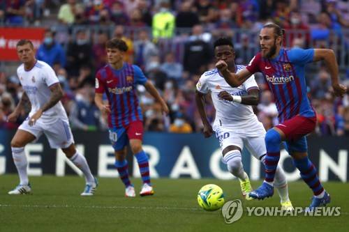 Barcelona's Oscar Mingueza, right, controls the ball during the Spanish La Liga soccer match between FC Barcelona and Real Madrid at the Camp Nou stadium in Barcelona, Spain, Sunday, Oct. 24, 2021. (AP Photo/Joan Monfort)