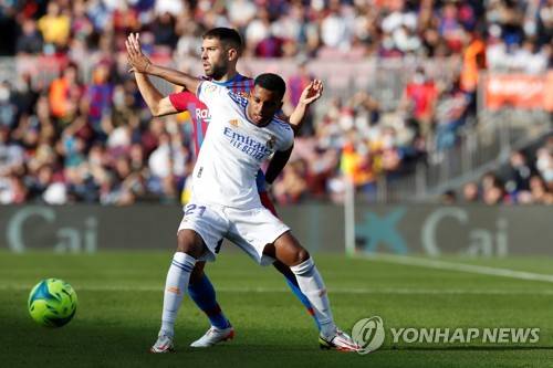 epa09543491 FC Barcelona's defender Jordi Alba (L) duels for the ball with Real Madrid's Brazilian winger Rodrygo Goes (R) during the Spanish LaLiga soccer match between FC Barcelona and Real Madrid at Camp Nou stadium in Barcelona, Catalonia, Spain, 24 October 2021. EPA/Alberto Estevez