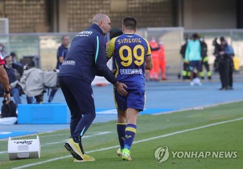 epa09543493 Hellas Verona's Giovanni Simeone (R) celebrates with his coach Igor Tudor (L) after scoring the 1-0 lead during the Italian Serie A soccer match between Hellas Verona and SS Lazio in Verona, Italy, 24 October 2021. EPA/FILIPPO VENEZIA
