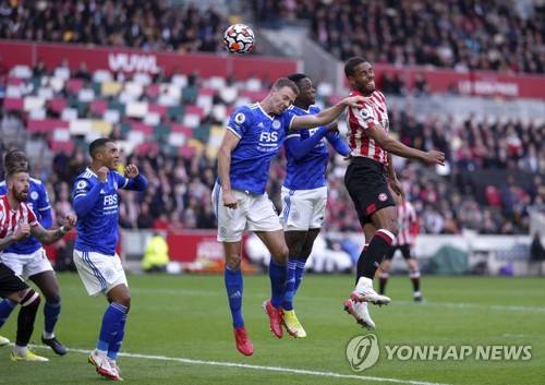 Brentford's Mathias Jorgensen, right, scores during the English Premier League soccer match between Brentford and Leicester City at Community Stadium, London, Sunday Oct. 24, 2021. (John Walton/PA via AP) UNITED KINGDOM OUT NO SALES NO ARCHIVE PHOTOGRAPH CANNOT BE STORED OR USED FOR MORE THAN 14 DAYS AFTER THE DAY OF TRANSMISSION