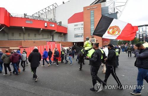 epa09543494 A fan carries a Manchester United flag outside the Old Trafford stadium ahead of the English Premier League soccer match between Manchester United and Liverpool FC in Manchester, Britain, 24 October 2021. EPA/PETER POWELL EDITORIAL USE ONLY. No use with unauthorized audio, video, data, fixture lists, club/league logos or 'live' services. Online in-match use limited to 120 images, no video emulation. No use in betting, games or single club/league/player publications
