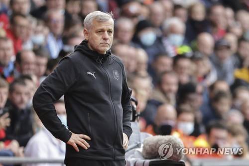 Rennes' head coach Bruno Genesio reacts during the French League One soccer match between Rennes and Strasbourg at the Roazhon Park stadium in Rennes, Germany, Sunday, Oct. 24, 2021. (AP Photo/Jeremias Gonzalez)