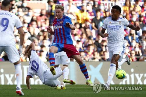 Real Madrid's Vinicius Junior, right, and Real Madrid's Luka Modric, 2nd left, challenge Barcelona's Frenkie de Jong during the Spanish La Liga soccer match between FC Barcelona and Reaal Madrid at the Camp Nou stadium in Barcelona, Spain, Sunday, Oct. 24, 2021. (AP Photo/Joan Monfort)