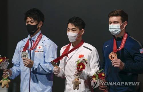 epa09543495 Gold medalist Xuwei Hu (C) of China shows off his medal with sliver medalist Daiki Hashimoto (L) of Japan and bronze medalist Brody Malone of the United States after the awarding ceremony for the men's Horizontal Bar of the 50th FIG Artistic Gymnastics World Championships in Kitakyushu, Japan, 24 October 2021. EPA/KIMIMASA MAYAMA