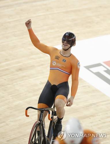 epa09543500 Harrie Lavreysen of the Netherlands celebrates after winning the men's Sprint final at the UCI Track Cycling World Championships in Roubaix, France, 24 October 2021. EPA/YOAN VALAT