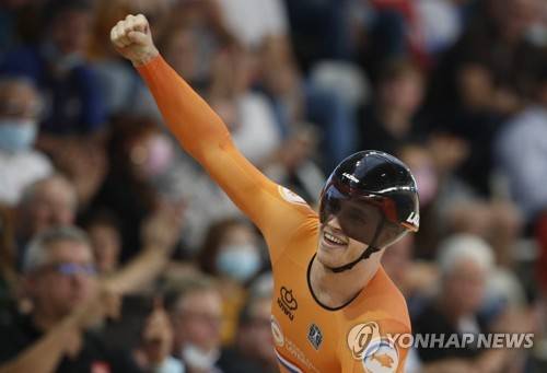 epa09543499 Harrie Lavreysen of the Netherlands celebrates after winning the men's Sprint final at the UCI Track Cycling World Championships in Roubaix, France, 24 October 2021. EPA/YOAN VALAT
