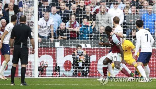 West Ham's Michail Antonio (9) scores his side's opening goal during the English Premier League soccer match between West Ham United and Tottenham Hotspur at the London stadium in London, England, Sunday, Oct. 24, 2021. (AP Photo/Ian Walton)