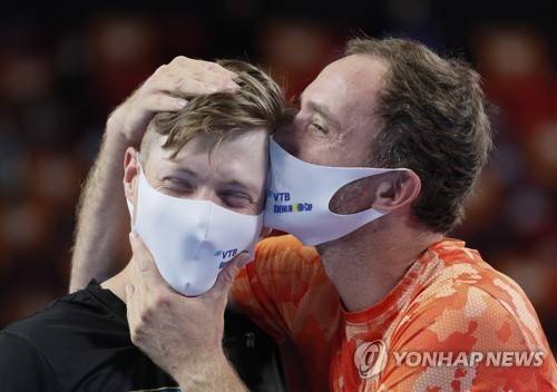 epa09543518 Harri Heliovaara (L) of Finland and Matwe Middelkoop (R) of the Netherlands celebrate after winning the men's doubles final against Tomislav Brkic of Bosnia and Herzegovina and Nikola Cacic of Serbia at the Kremlin Cup tennis tournament in Moscow, Russia, 24 October 2021. EPA/YURI KOCHETKOV
