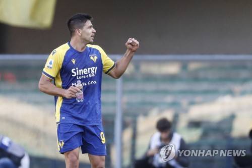 epa09543535 Hellas Verona's Giovanni Simeone celebrates after scoring the 2-0 lead during the Italian Serie A soccer match between Hellas Verona and SS Lazio in Verona, Italy, 24 October 2021. EPA/EMANUELE PENNACCHIO