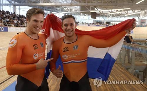 epa09543531 Harrie Lavreysen (R) of the Netherlands celebrates after winning the men's Sprint final at the UCI Track Cycling World Championships in Roubaix, France, 24 October 2021. EPA/YOAN VALAT