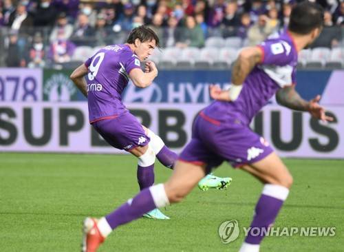 epa09543551 Fiorentina's forward Dusan Vlahovic scores his team's third goal during the Italian Serie A soccer match between ACF Fiorentina and Cagliari Calcio at the Artemio Franchi stadium in Florence, Italy, 24 October 2021. EPA/CLAUDIO GIOVANNINI