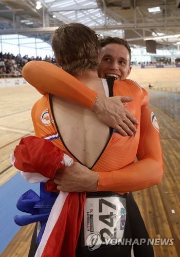epa09543590 Harrie Lavreysen (back) of the Netherlands celebrates with a teammate after winning the men's Sprint final at the UCI Track Cycling World Championships in Roubaix, France, 24 October 2021. EPA/YOAN VALAT