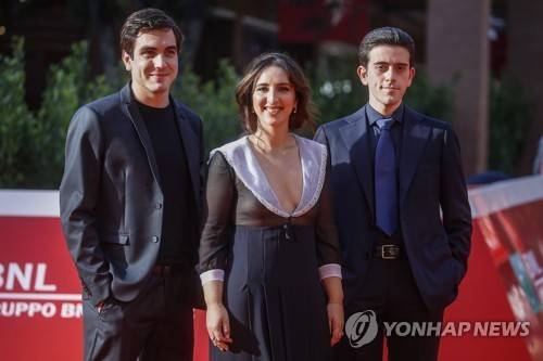 epa09543592 (L-R) Mario Autore, Anna Ferraioli Ravel and Domenico Pinelli pose on the red carpet for the presentation of the movie 'I fratelli De Filippo' at the 16th annual Rome International Film Festival, in Rome, Italy, 24 October 2021. The Festa Del Cinema Di Roma runs from 14 to 24 October 2021. EPA/FABIO FRUSTACI