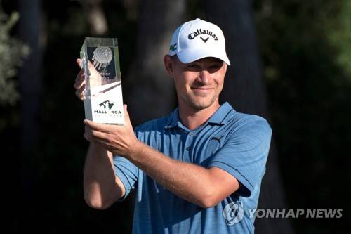 epa09543986 Danish golf player Jeff Winther celebrates after winning the Mallorca Golf Open played at the pitch of Santa Ponsa I in Calvia, Mallorca, Balearics Islands, Spain on 24 October 2021. EPA/CATI CLADERA