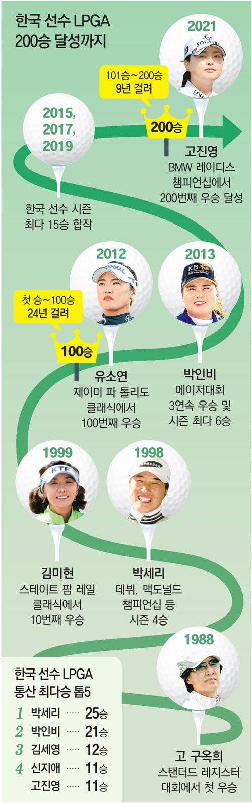 한국 여자 선수들은 고 구옥희 프로가 1988년 스탠더드 레지스터 대회에서 첫 승을 거둔 뒤 33년 만에 200승을 합작했다. 통산 11승을 거둔 고진영은 박세리(25승), 박인비(21승), 김세영(12승), 신지애(11승)의 뒤를 이었다. 이들을 포함해 48명의 한국 선수가 200승에 힘을 보탰다. 한국보다 더 많은 우승을 차지한 나라는 미국(1527승)뿐이다.