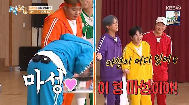 김종민, 시작부터 머리박기 몸개그..라비 "마성의 매력"(1박2일)[결정적장면]