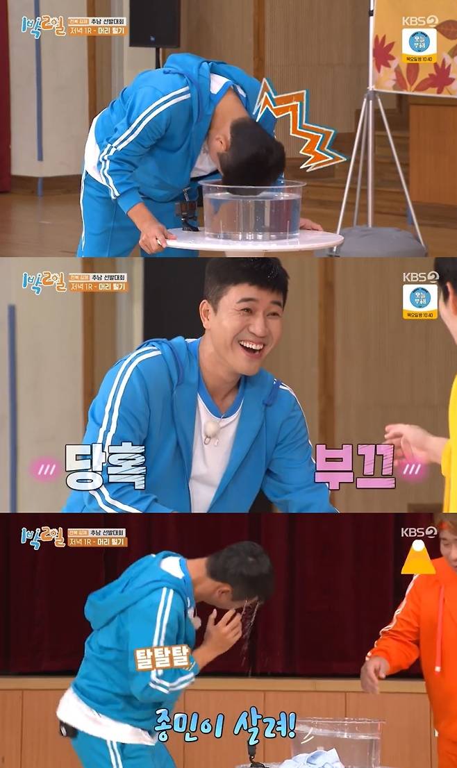 김종민은 물이 가득 찬 대야에 머리를 적시려 숙였다가 그대로 머리를 박아버려 고통과 당혹감에 몸무림 쳤다.