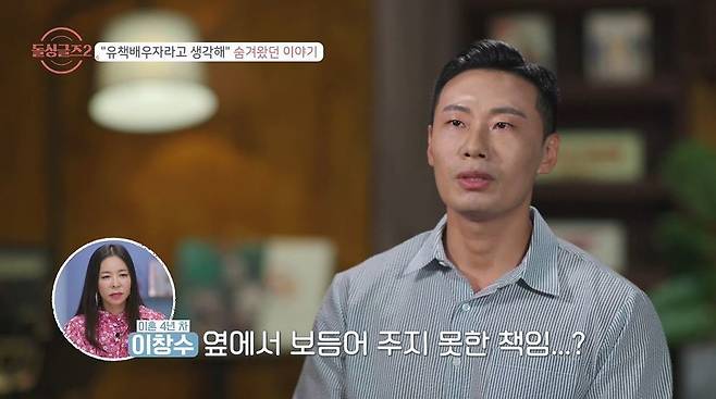 이창수는 이혼 사유 질문에 몹시 망설이는 모습을 보였다. 이어 "저는 제가 유책 배우자라고 생각한다"라고 말했다. 그러면서 이창수는 "유책이란 뜻이 혼인 파탄에 책임이 있는 사람만 유책이 아니라 그냥 당신한테는 어떤 책임이 잇는가란 물음 같다. 저는 배우자가 힘들어할 때 옆에서 보듬어 주지 못한 책임이있어서 그래서 유책배우자라고 생각한다"라며 울먹였다.