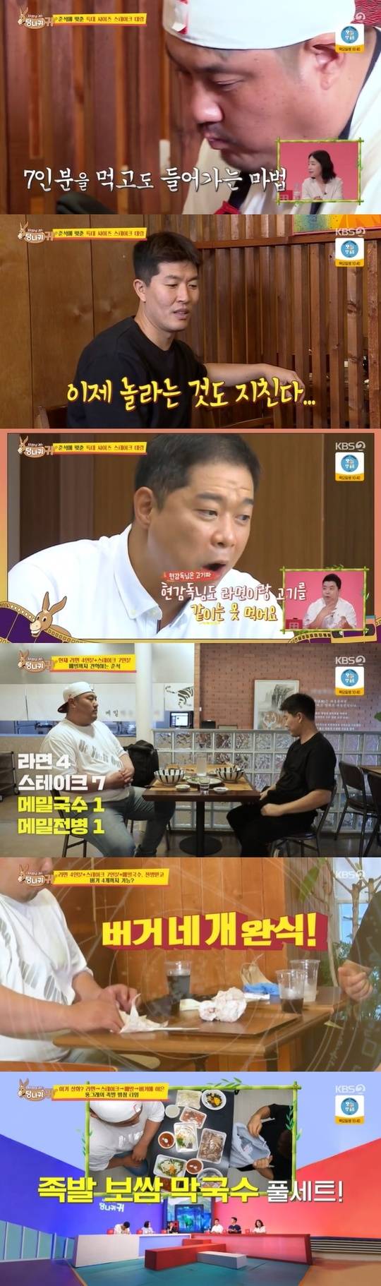 다음은 김병현이 가장 최근 오픈한 메밀집과 햄버거집 차례였다. 최준석은 메밀면과 메밀전병으로 구성된 메밀한상을 1그릇씩 먹은 뒤, 바로 옆에 있는 햄버거집으로 이동해 김병현이 직접 만들어준 버거 네가지를 순식간에 먹었다.