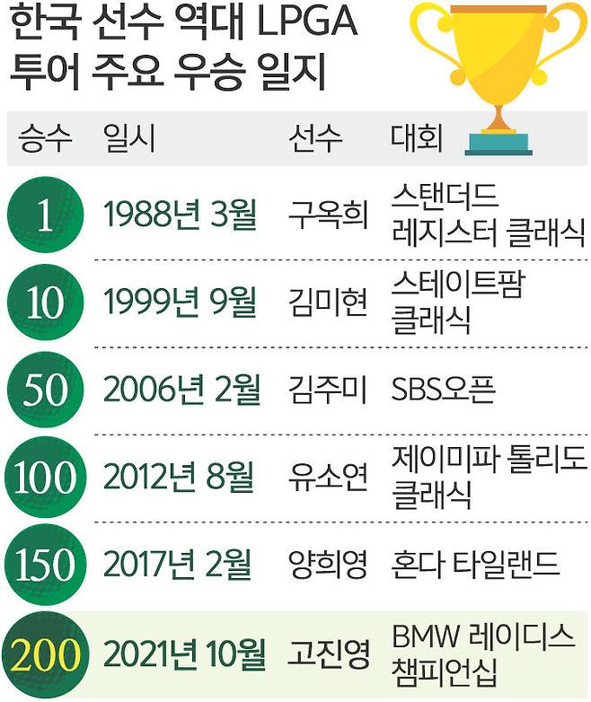 한국선수의 미국여자프로골프(LPGA) 투어 첫 우승은 1988년에 나왔다. 그해 3월 고(故) 구옥희 전 KLPGA 협회장이 스탠더드 레지스터에서 역사적인 첫 승을 달성했는데 그때까지만 해도 골프가 대중화되지 않아 선수층이 두껍지 않던 시절이었다. 이후 10년 뒤인 1998년 박세리(44)가 US여자오픈 등 메이저에서만 2승을 따내며 본격적으로 한국 선수들의 미국 진출 길이 열렸다. 그의 ‘맨발샷’을 지켜본 ‘세리키즈’들이 무럭무럭 자라났고 2012년 유소연(31·메디힐)이 제이미파 톨리도 클래식에서 100승을 달성하는 이정표를 세웠다. 한국 선수들이 100승을 합작하기까지 무려 24년이나 걸렸는데 200승은 10년도 안 돼 달성했다. 고진영(27·솔레어)이 역사적인 기록의 주인공이 됐다.