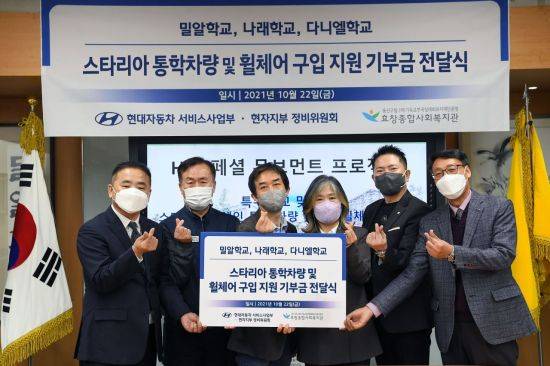 이를 위해 현대차는 지난 22일 서울 강남구 밀알학교에서 최희복 서비스사업부장(상무), 남강희 현대자동차지부 정비위원회 의장, 김정선 나래학교장, 최병우 밀알학교장, 이성만 다니엘학교장, 이정민 효창복지관장 등이 참석한 가운데 스타리아 통학차량 및 휠체어 구입지원 기부금 전달식을 진행했다.
