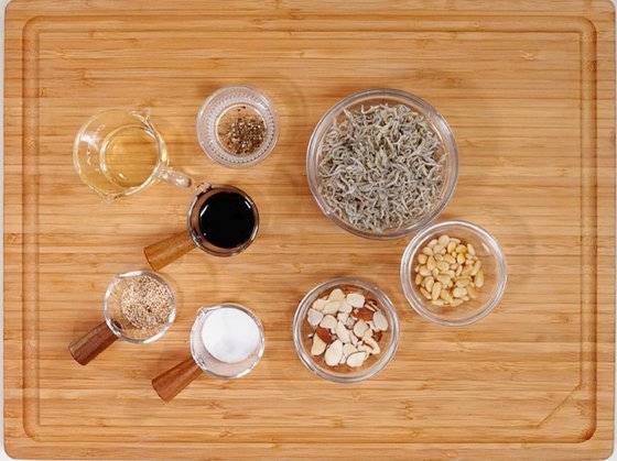 재료(2인분) : 잔멸치(세멸 또는 지리멸) 50g, 식용유 2큰술, 아몬드 슬라이스 2큰술, 잣 1큰술, 통깨 약간
