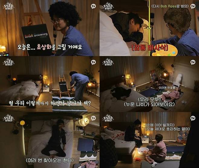이장원이 들고 나선 것은 다름 아닌 그림. 이장원은 다양한 자연 풍경 등 어려운 그림을 순식간에 멋지게 그려내며 ‘참 쉽죠?’라는 고정 멘트로 화제를 낳았던 화가 ‘밥 로스’로 변신해 유희열 앞에서 그림을 그리며 평화로운 분위기로 그를 잠들게 하겠다는 것. 다만 ‘밥 로스’의 외모까지 따라 하기 위해 뽀글뽀글한 가발까지 장착한 그의 모습은 절로 웃음을 자아내, 과연 그의 꿀잠 유발 계획이 성공할 수 있을지 기대를 모으고 있다. 열정적으로 미션에 나섰던 이장원은 스스로도 웃음을 참지 못하며 “우리 이렇게까지 하면서 살아야 해?”라는 자조 섞인 멘트로 현장을 웃음바다로 만들었다는 후문이다.