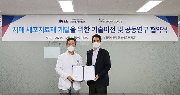 차 의과학대학교 분당 차병원은 에스바이오메딕스와 치매 세포치료제 개발을 위한 기술이전 협약을 맺었다.