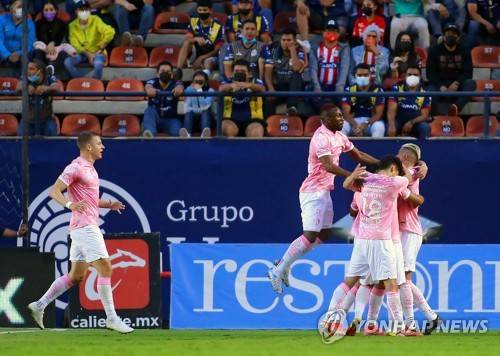 epa09544746 Atlas players celebrate a goal against Atletico de San Luis during the Liga MX 2021 Apertura Tournament soccer match between Atletico San Luis and Atlas at the Alfonso Lastras Stadium in San Luis Potosi, Mexico, 24 October 2021. EPA/Victor Cruz