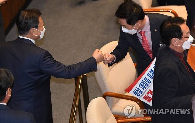 (서울=연합뉴스) 안정원 기자 = 문재인 대통령이 25일 서울 여의도 국회 본회의장에서 2022년도 예산안 시정연설을 마친 뒤 성남 대장동 개발사업 특검 수용을 촉구하는 손팻말을 든 국민의힘 김기현 원내대표와 인사하고 있다. 2021.10.25 [국회사진기자단]