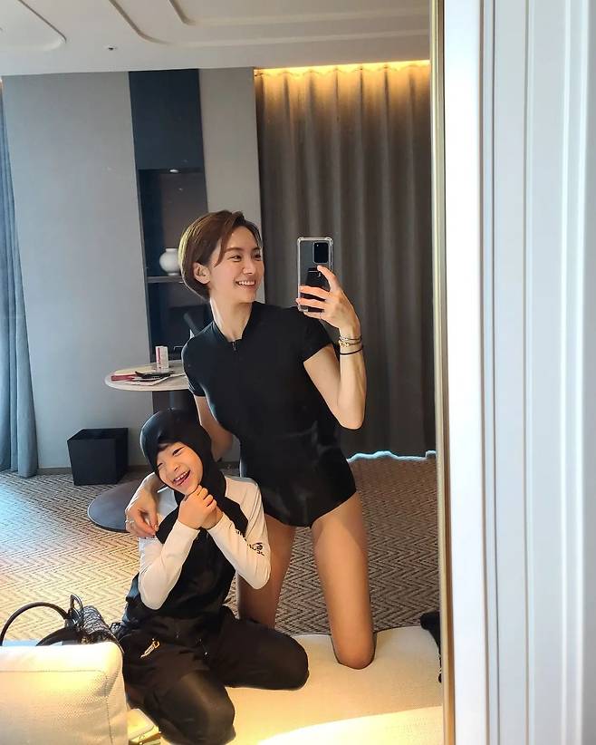 공개된 사진 속 유하나는 수영복을 입은 채 아들과 거울 셀카를 찍고 있는 모습이다. 큰 아들의 애교 있는 표정 연기가 보는 이들의 시선을 사로잡는다.
