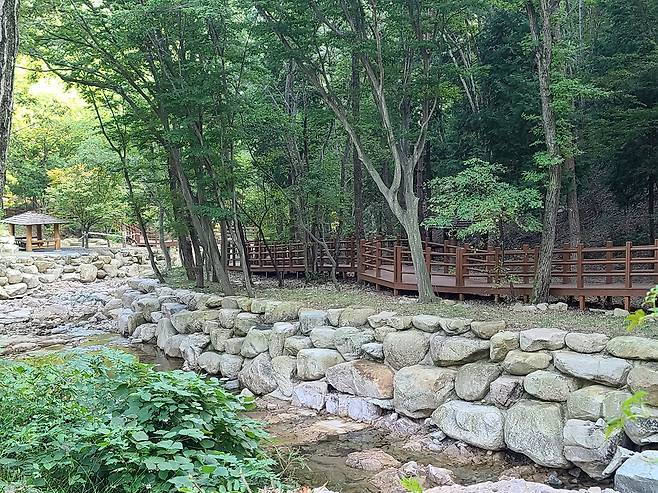 ㅇ 치유의 숲에는 산림치유 프로그램을 위해 숲길, 툇마루 등산길(데크로드), 물길 등이 잘 조성되어 있어 치유의 숲 방문객은 주변을 거닐거나 험한 등산로가 아닌 산책길에서 가벼운 산행을 즐길 수 있다.