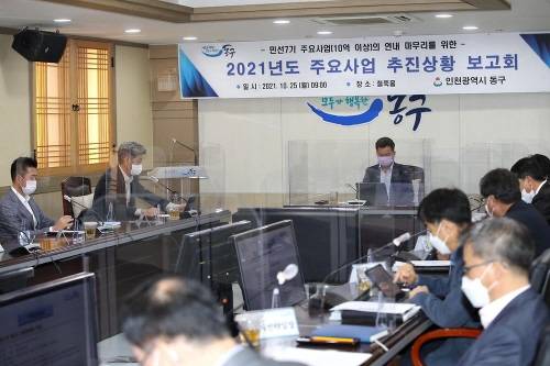 인천 동구(구청장 허인환)가 25일 구청 철쭉홀에서 '2021년 하반기 주요·역점사업 추진상황 보고회'를 개최하고 사업별 문제점 분석 및 대응 방안을 논의했다.