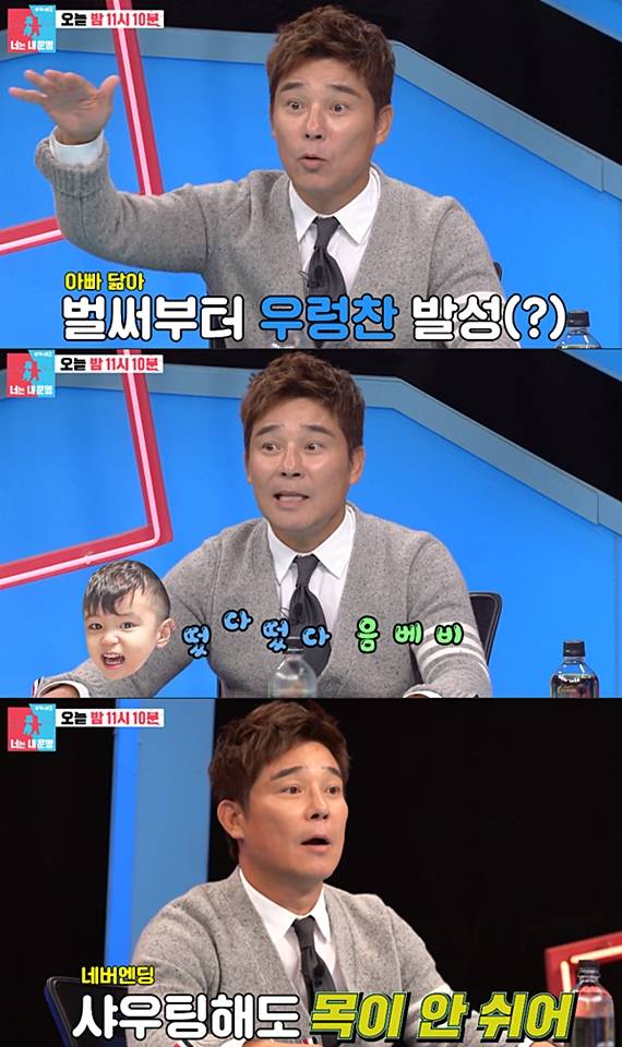 임창정은 “그런데 아들이 하이 톤으로 돌고래처럼 운다. 그렇게 10분만 울어도 목이 쉬어야 되는데 절대 안 쉰다”고 말해 MC들의 놀라움을 자아냈다. 임창정은 또 “음정이 너무 좋다. 어린이집에서 ‘떴다떴다 비행기’를 정확한 음정으로 부른다. 깜짝 놀랐다. ‘얘는 되겠다’는 생각을 했다”고 덧붙였다.