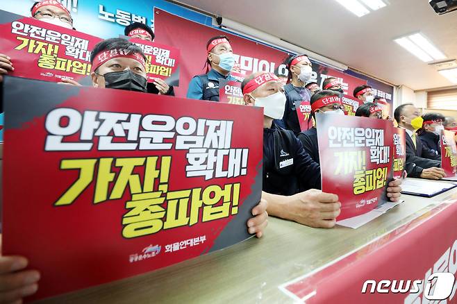 (서울=뉴스1) 조태형 기자 = 25일 오후 서울 중구 전국민주노동조합총연맹에서 공공운수노조 화물연대본부 조합원들과 지지 단체 관계자들이 총파업 일정 선포 기자회견을 하고 있다. 2021.10.25/뉴스1