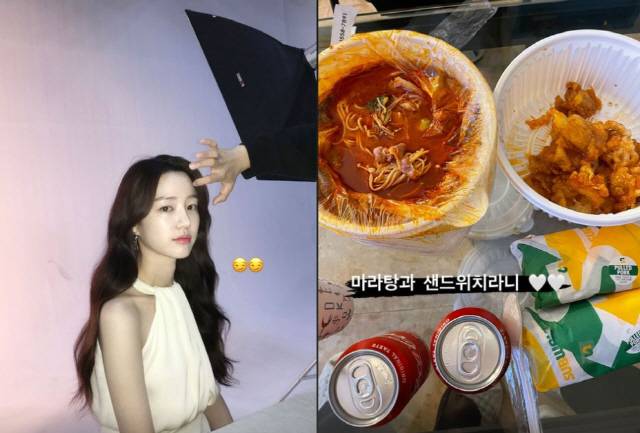 25일 이유비는 자신의 인스타그램 스토리를 통해 "마라탕과 샌드위치라니♥"라며 한 장의 사진을 게재했다.