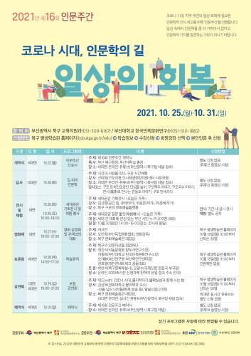 교육부와 한국연구재단이 주최하고 부산대학교와 북구청이 주관하는 이번 행사는 '코로나 시대-인문학의 길, 일상의 회복'이라는 주제로 위드 코로나 시대 일상회복에 대한 인문학적 인식을 제고하기 위해 추진됐다.