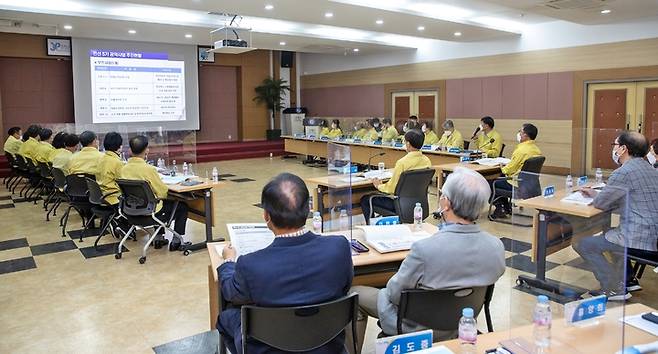 [증평=뉴시스] 강신욱 기자 = 충북 증평군은 25일 오후 군청 대회의실에서 홍성열 군수 등 간부공무원과 민간인 공약이행평가단이 참석한 가운데 민선 5기 공약사업 추진현황 보고회를 열고 있다. (사진=증평군 제공) 2021.10.25. photo@newsis.com