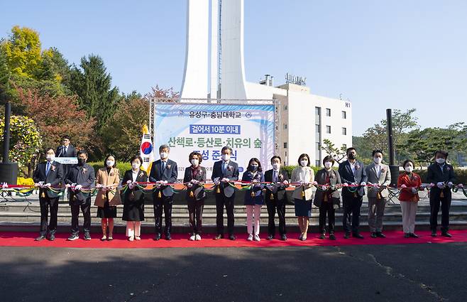 이진숙 총장과 정용래 구청장 등 양기관 관계자들은 25일 충남대 대덕캠퍼스 교시탑 광장에서 '걸어서 10분 이내 산책로·등산로·치유의 숲 조성 준공 기념식'을 개최했다.