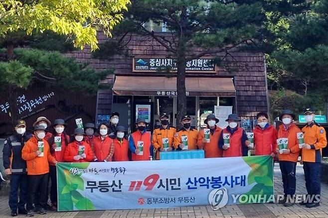 (광주=연합뉴스) 광주 동구 무등산국립공원 증심사 탐방지원센터 주변에서 지난 24일 오전 소방공무원과 119시민산악봉사대가 산불·산악사고 예방 캠페인을 하고 있다. 광주 동부소방서는 가을 산행 철을 맞아 등산객에게 응급상황 발생 시 대처 방법을 안내하고 산불 예방을 당부했다. 산림 정화 활동을 병행했다. 2021.10.25 [광주 동부소방서 제공. 재판매 및 DB 금지]