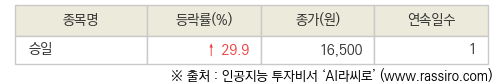[fnRASSI]오늘의 상한가, 승일 29.9% ↑