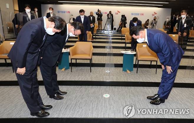 (이천=연합뉴스) 백승렬 기자 = 김부겸 국무총리와 안경덕 고용노동부 장관이 25일 경기도 이천시 SK하이닉스 R&D센터에서 열린 '청년희망ON 행사'에서 최태원 SK회장에게 청년고용에 대한 감사 인사를 하고 있다. 2021.10.25