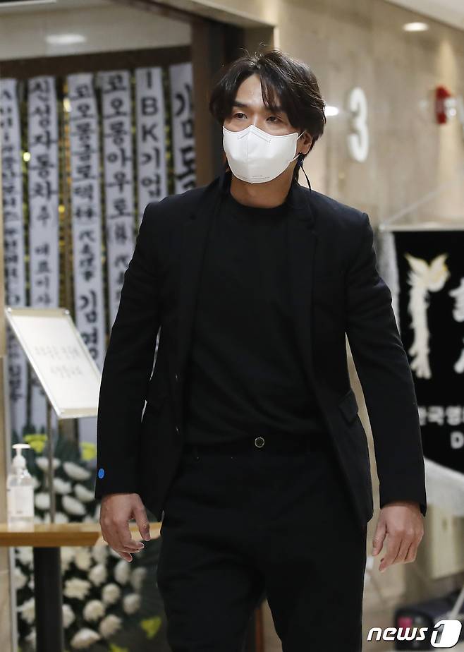 (서울=뉴스1) 권현진 기자 = 배우 김태훈이 25일 서울 신촌세브란스병원 장례식장에 마련된 고(故) 이태원 태흥영화사 전 대표의 조문을 마친 뒤 빈소를 나서고 있다.