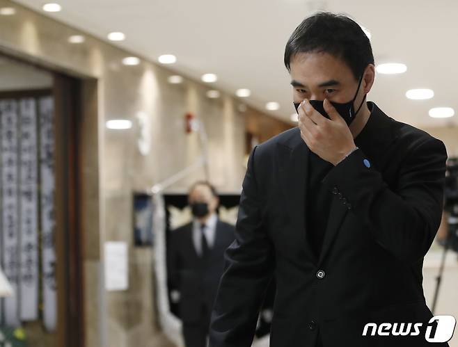 (서울=뉴스1) 권현진 기자 = 배우 김태훈이 25일 서울 신촌세브란스병원 장례식장에 마련된 고(故) 이태원 태흥영화사 전 대표의 조문을 마친 뒤 빈소를 나서고 있다.