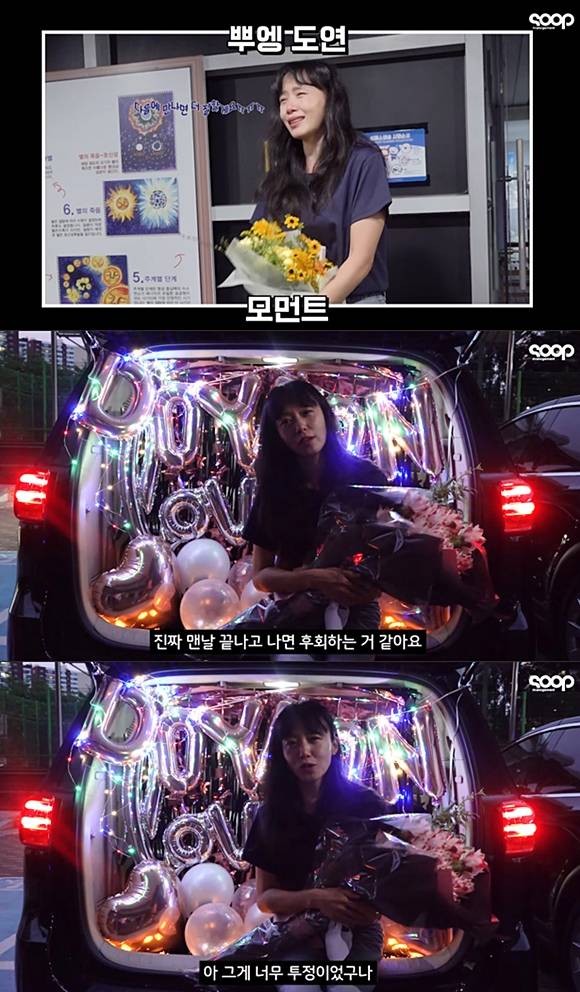 이날 마지막 촬영을 끝낸 전도연은 스태프들로부터 꽃다발을 건네 받고 “다음에 만나면 더 잘할게”라며 참아온 눈물을 터트렸다. 이어 소속사 직원들이 차량 내부에 풍선과 꽃을 가득 채워 서프라이즈 파티를 준비했고, 이를 본 전도연은 또 한번 울컥하며 감동했다.
