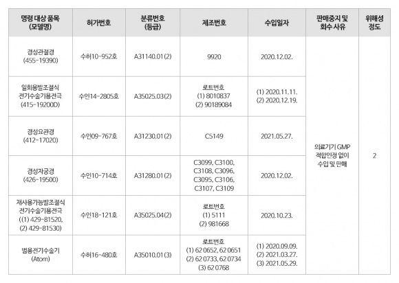 해당 제품은 다음과 같다. 제조소 MGB Endoskopische Gerate GmbH Berlin의 경성관절경(수허 10-952호), 경성요관경(수인 09-767호), 경성자궁경(수인 10-714호), 일회용발조절식전기수술기용전극(수허 14-2805호), 재사용가능발조절식전기수술기용전극(수허 18-121호)과 제조소 EMED SP.ZO.O.SP.K.의 범용전기수술기(수허 16-480호).