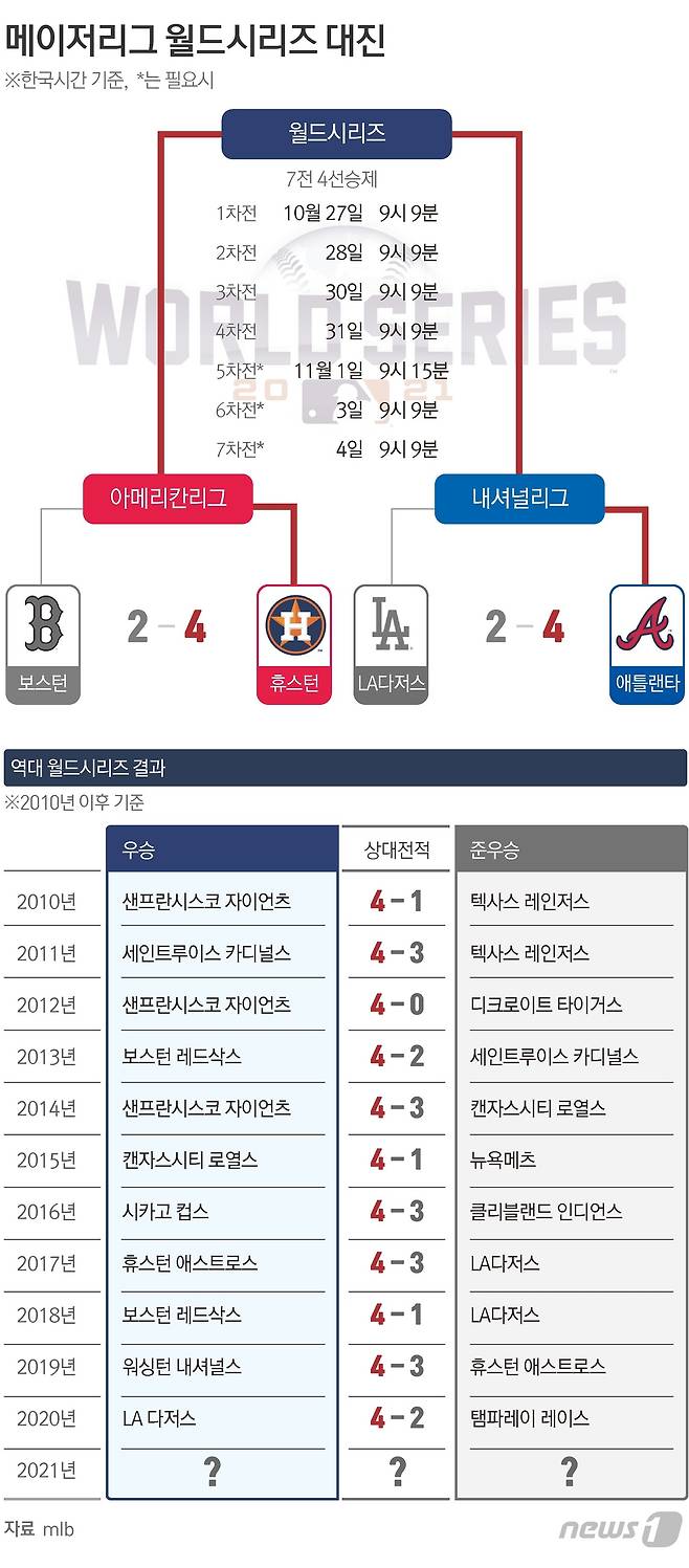 (서울=뉴스1) 김초희 디자이너 = 2021년 미국프로야구 메이저리그의 챔피언을 가리는 월드시리즈가 27일(한국시간)부터 시작된다. 올해 월드시리즈는 아메리칸리그 챔피언인 휴스턴 애스트로스와 내셔널리그를 제패한 애틀랜타 브레이브스가 대결한다.