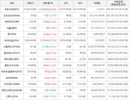 가상화폐 시세 (제공: 암호화폐 거래소 업비트)현재 암호화폐 거래소 "업비트"에 따르면 가상화폐 대장 격인 비트코인의 시세는 전일 대비 1,339,000원(1.8%) 상승한 75,840,000원에 거래되고 있다.